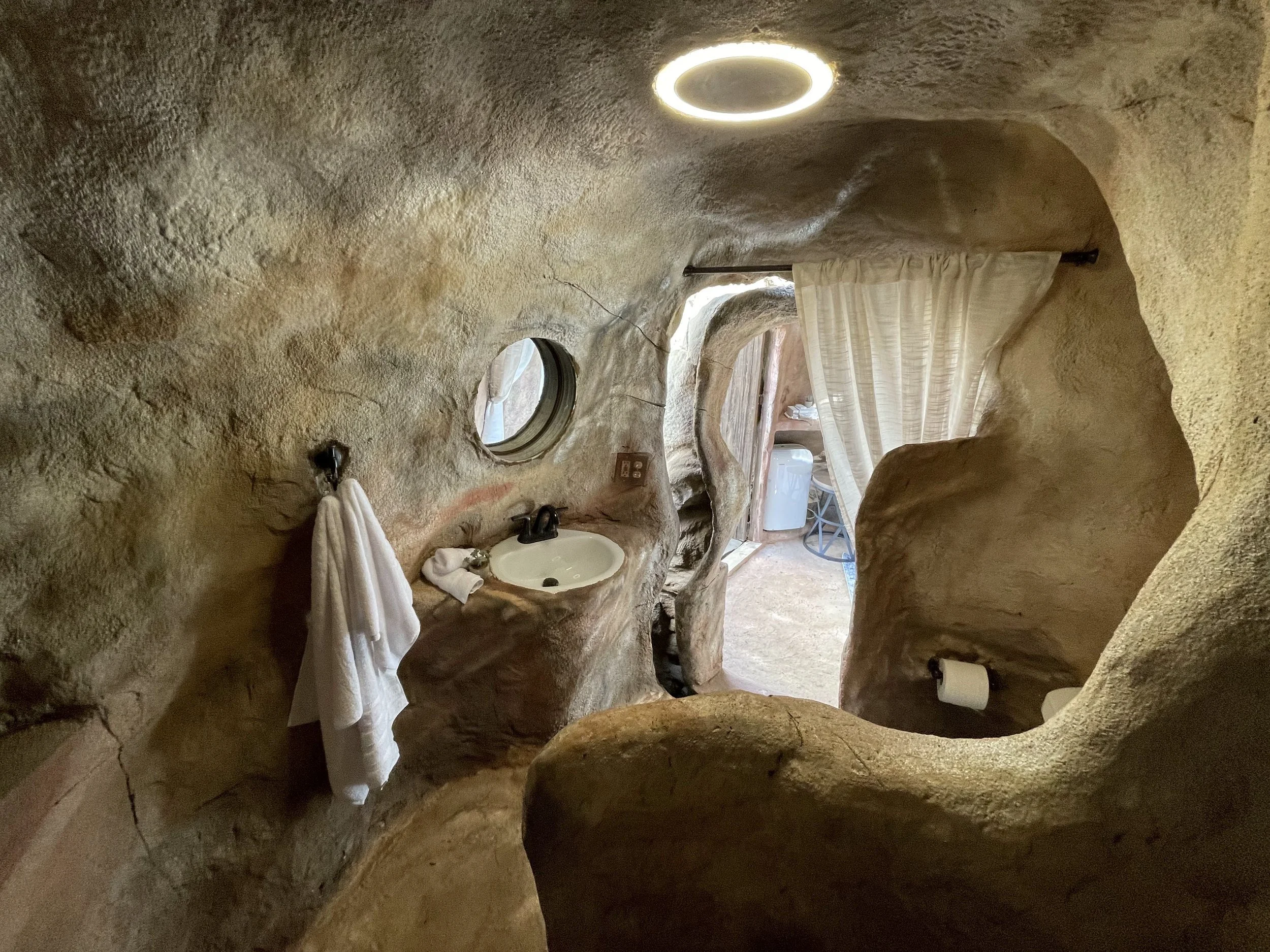Tucked at the base of the mountain with stunning views of Zion’s backyard, this artificial rock cabin is unlike any glamping experience you’ve seen. Inside, enjoy a queen bed, private bathroom, AC, heat, and plenty of cozy space to unwind.